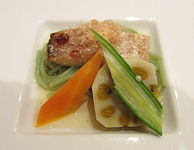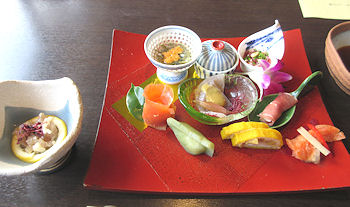 | ホテルからは、どの部屋からも見えないと言われたことだった(こちらから聞かないのに言われた)。 それはそうと、部屋に入ってまずは温泉だが、それほど大きな浴場ではない。しかし、とてもなめらかなお湯で、北海道の「つるつる温泉」のような印象だ。露天の方の温度もちょうど良く、心地良い食前の時間を過ごせた。チェックインがそれほど早い時間でなかったので、温泉に浸かって少しゆっくりしたら食事の時間になった。汗をかいていたので食事処での生ビールは格別だった。旅行出発の数日前にこのホテルから最終確認の電話があって、そのときに幾らか追加すると(いくらだったか忘れた)料理の品数と質をアップします、と言われたのだが、そんなにたくさん食べられないので断っていた。 |