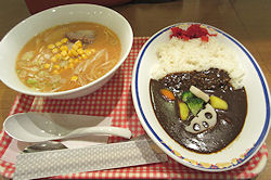 | ↓ 出発ゲートの近くでみそラーメンと野菜カレー |