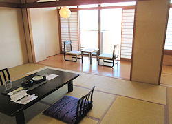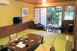 その後は今日の宿泊地である黒川温泉に向かう。時間的に少し早かったので、「風の舎」という観光案内所の駐車場に車を停めて温泉街を少し歩いてみた。やはり暑いので「白玉っ子」という店でかき氷を食べることにした。メニュー見ると何と918円(税込)もするではないか。ずいぶん高いなあと思って周りを見るとどうやら巨大なようだ。そしてみんなひとつを2人で食べている。というわけで我々も1つ注文して2人で食べた。高さは25cmくらいはあったような感じだ。結局はちょっと歩いてかき氷を食べただけで車に戻り今日の宿へ。今日は「こうの湯」という温泉街からはちょっと離れたところにある「離れ」だけの宿だ。以前阿蘇の近くに泊まったときもそういう宿だったが、今日の方が母屋がしっかりしていて「宿」と | ↓ 部屋は普通の和室でちょっと暗めだ![]() |
