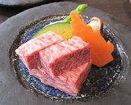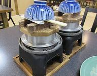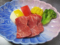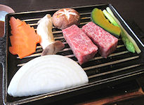 | 食事まで少し時間があったので部屋の冷蔵庫からビールを出して飲んだが、ちょっとぬるくて大変不満だった。 食事は母屋の2階へ。個室ではないが隣とは十分離れているし、満席ではなかったので落ち着いて食べることができた。メイン料理は肥後牛の玉鍬焼きで、想定以上に量が多かった。だんだん年を取ってくると、ああいう超霜降りの肉はあまりたくさん食べられない。それでも大変美味しくいただいた。 |