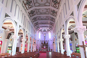 | というわけで、「平戸オランダ商館」に到着したが駐車場が見当たらない。路上に停車して案内表示を見に行くと何と駐車場はないのでちょっと離れた市民駐車場を利用してくださいとのこと。それは時間の無駄なので、先に「平戸ザビエル記念教会」に行くことにする。地図ではすぐ横にありそうなのだが、道が通じていないらしく、けっこう遠回りな感じで到着した。ここはちゃんと広い駐車場がある。ここは最初は「聖フランシスコ・ザビエル記念聖堂」と呼ばれていたそうで、最近になって今の名称になったそうだ。平戸市街に最も近いこともあって、ここまでの教会の中で一番観光客が多かった。教会と言うより西洋のお城という雰囲気の建物は白以外に薄い緑色が使われているのが特徴的だ。内部はやはり明るくて美しいが、ステンドグラスは「紐差教会」のほうが素晴らしかった。 |