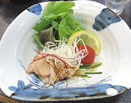 | ← このような状態でセットしてあった。 ↑ 左 ひらめの薄造り 右 平戸牛の陶板焼き 写真下 出された数々の料理。お品書きがなかったので詳しいことが不明だ。(聞いたが忘れた) |