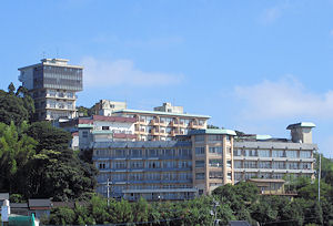 | 今日泊まるのは「旗松亭」という大きな温泉ホテルだ。急な坂に建てられていて、フロントが4階ということになっているし、建て増ししたのだろうが大きく3つくらいの建物に分かれている。ほとんどの部屋が平戸湾側で海と城を見ることができるようだ。今日は平戸湾で花火大会があり、「花火が見える部屋」というプランだ。今回の旅行の中ではランク的にはやや低い感じだが、平戸にはいわゆる高級旅館がないようで、その中では一応いい方のようだ。 部屋に入ってすぐ、夕食前の温泉に浸かることにした。部屋があるのは確か「本館」でその他に「浪漫亭」「やわらぎ荘」という風に分かれていたのだが、本館にはいわゆる大浴場はなく、海側の建物に露天風呂がある。夕食前はそちらに行ったがあまり広くないうえにとても混んでいた。立ち上がると海も城も見えるが、お湯に浸かると何も見えないのが残念だった。 |