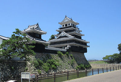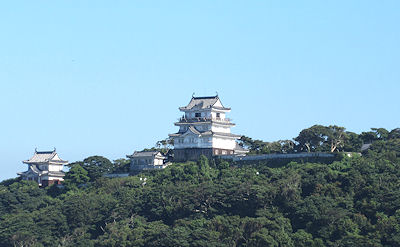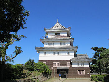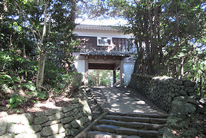 | か、と思うような道で、相当気をつけて走らないとナビもしっかり指示できないようなところにあった。 市街地に戻ってまず最初は「平戸城」に行く。物産館があるところから少し坂道を歩いていく城は復元されて50年ほどという比較的新しいもので、平戸藩ゆかりの品を展示する施設になっている。下から見ると、山の頂上にそれなりの雰囲気で建っている城で期待を抱かせるし、それなりの坂道を登っていくと、門や石垣が見えてきて、雰囲気を感じるが、いざ城の正面まで来てみると城自体は真新しい感じで大きさもそれほどではないのでやや拍子抜けだ。最上階からの景色はなかなかで平戸湾を一望できるのだが、外側の柵が高さが低いのとちょっと頼りない造りで怖い感じだった。ちなみに後で地図を見ると、来るときにもう少し手前に別の道があって、そちらの方が城に近い |