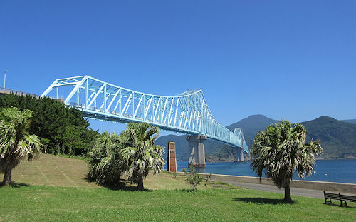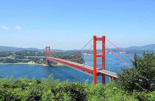 | 平戸ではけっこう見る予定のところが多いのであまりゆっくりはしていられない。ガイドブックを見ると生月島に渡る橋がきれいなかんじだったので、行ってみることにした。地理的にも平戸市街に戻るのにぐるっと回る感じでちょうど良い。途中「隠れキリシタンの里」とか言われる集落があるはずだったが、運転しながらでははっきり確認することはできなかったのでそのまま走ると「生月大橋」が見えてきた。平戸大橋よりはかなり長い感じだ。こういうのを見るとすぐに撮影ポイントを探すのだが、どうやら渡りきったところに道の駅があるらしいのでそのまま渡ってしまった。その道の駅の周りの公園っぽいところから写したのが右の写真だ。やはり天気が良いと何でもきれいに写る。その後はせっかく橋を渡ったからというだけの理由で、生月大魚籃観音とガスパル様というキリシタンの殉教地を見て(どちらもさほど観光に力を入れていない感じ)、市街地に戻ることにした。特にガスペル様に行く道は、本当にここでいいの | ↓ 道の駅から見る生月大橋。空の青と芝生の緑に挟まれた水色の橋が美しい![]() |