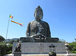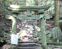 | さて、本当は大分空港から中津城に行ってからの宿泊にしたかったのだが、どうもうまく観光ルートを作ることができなくて、今日は「熊野磨崖仏」だけを見て別府温泉泊という計画だ。空港でレンタカーを借りて、まっすぐ目的地へ向かう。30分程度で到着し、初日から坂道を登る。やはり我が家の旅行は必ずこういうのがある。ガイドブックに「急な石段」と書いてあったが、最初はそれとは違う坂道で、それはそれなりに階段も多くきつい、そしてそろそろ疲れてきたという頃に、右のようなまさにガイドブックに出ている石段が登場した。いつも思うことだが、よくこんなところに仏像を作ろうとか、神社や寺を建てようとか考えるものだ、と感心してしまう。 とても暑くて、汗びっしょりになりながら到着したところには、これまたガイドブック通りの石仏があった。岩肌を削ったものでかなり大きい。自然にさらされているので多少は痛みがあるようで、ちょっととぼけたような表情になっているのが面白い。 |