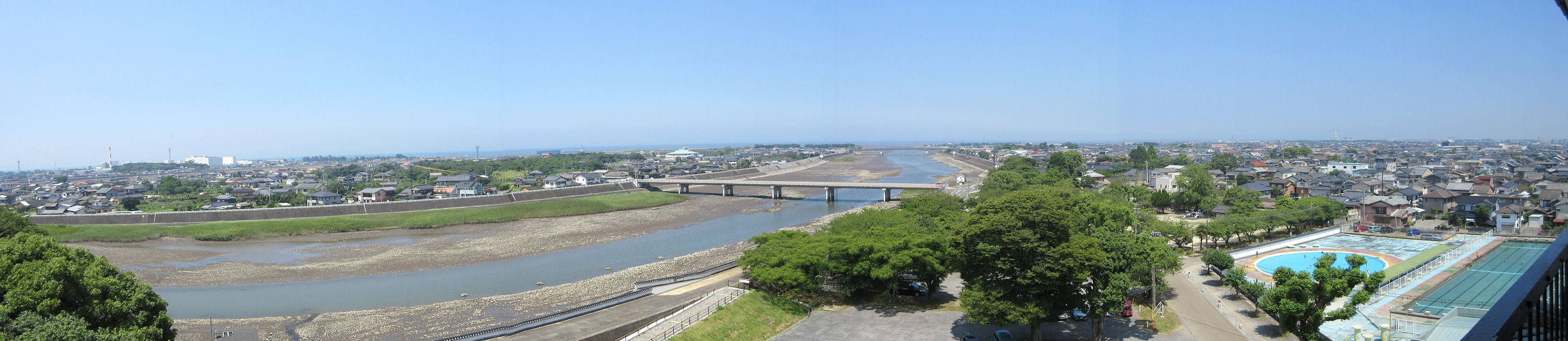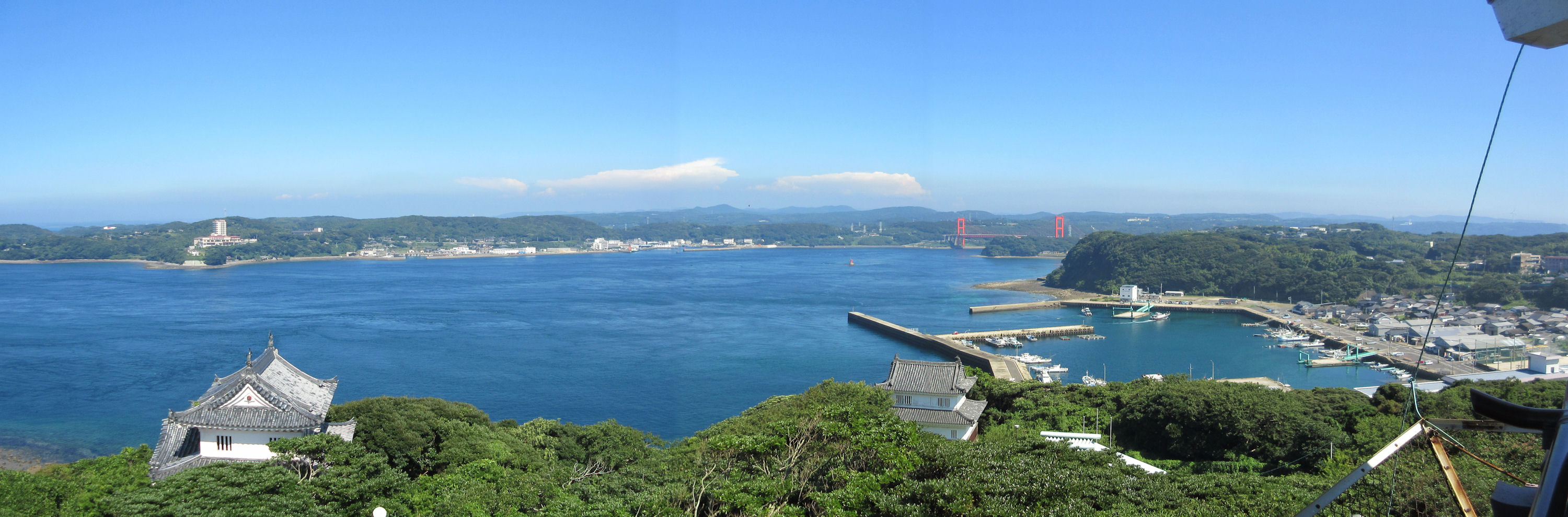 さてその後は今年のメインの一つでもある「中津城」へ。昨年の大河ドラマでは関係する城だったから人も多かっただろうが、やはり今年はあまり観光客はいない。左の写真を撮ったすぐ近くに車を停めることもできた。ゆっくり見るにはこれくらいの方がいい。さて、城は復元ではあるが当時のままの石垣や、石垣からせり出すように建つ天守が珍しい。天気も良く、ガイドブックにあるような写真を撮ることができた。大きくはないが、なかなか美しい外観だ。また、海のすぐそばにあり、海や川も堀の一部として建てられたということで、天守の最上階からの景色が良かった。 メインの一つだったとは言え、それほど見所が多いわけでもなく、それほど時間を使わずに次の目的地に向けて出発となった。昼食の「ねぎ焼き」を2人で1枚にしたため少し足りなかったのだが、中津でさっと寄れるような店もわからなかったし、これからの経路上にもないのでそのまま次の目的地に向かうことにした。 ↓天守の最上階からの眺望。周防灘も見える(クリック拡大) |