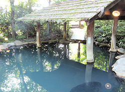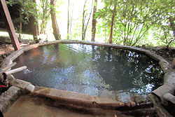 いう感じがする。部屋に露天風呂が付いているが、部屋自体は立派な感じではなくちょっと期待外れだ。 チェックイン後は当然のことながらまず大浴場。大浴場といっても、母屋はそんなに大きくなく部屋から50m近く歩いて行くことになる。そしてそこはわずかな洗い場と露天風呂だけ、という野趣あふれる造りだった。ただ、露天風呂の奥の方に、この宿自慢(?)の深さ150cmの「立ち湯」がある。階段状に降りていくのだが、最も深いところだと身長が180cmくらいないと口がふさがってしまうので、つかまるための太い棒がある。なかなか面白いが落ち着いて湯に浸かるという感じではない。早々に切り上げて部屋に戻ってきた。 ← 一応「大浴場」扱いの露天風呂 ↓ 左 部屋に付いている露天風呂。結構大きい 右 それぞれの離れに分かれる |