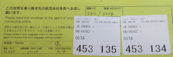 | はまっすぐ大分空港まで届いた。羽田空港の第1と第2のターミナル間はけっこう距離があるのでとても助かった。具体的な手続きとしては、旭川で荷物を預けるときに「羽田からJALで大分まで」と告げると右のようなものを渡されるので、羽田に着いたらJALの手荷物カウンター(普通に預けるのとは違う場所だった)でこれを見せて手続きをする、というものだ。少し時間を取られるが、検査の列に並んで手続きするよりは楽だ。ちなみに、旭川からの便はAirDoとの共同運航便だが、AirDoは提携していないのでこの手続きはできないそうだ。 | ![]() |