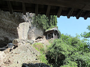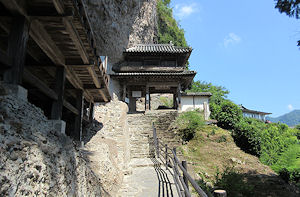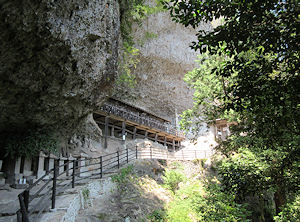写真上段 左 リフトを降りて寺に向かう。「千体地蔵」が見える 中 正面に見えるのが「山門」。左端に見えるのは「千体地蔵」 右 岩にめり込むように建てられている「本堂」 写真下段 |