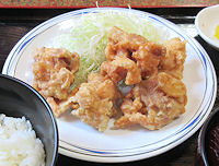 さて、気を取り直して旅行の続きだ。そろそろ昼食の時間なのだが、場所が決まっていない。行動しながら、竹田を省略して長湯温泉に行くという話になっていたので、途中で何かを食べなければならない。そこで、途中にある道の駅「おおの」というところで「軍鶏の親子丼」を食べようということになった。しかし、レストランに行く手前にあった「鶏天」につられ、それを軽く食べようということになってしまった。で、車で少し食べながら、やはり竹田に行こうということになり、それなら竹田で昼食ということで決定した。大分県といえばやはり「鶏天」で、別府で食べられなかったのでどうしても食べたいのだ。一応この辺りでは有名な「丸福」という店で、定食で頼んだのだが、けっこうご飯の量が多く、一人分は単品にすれば良かったかもしれない。鶏天は、字の通り鶏の天ぷらで、以前テレビでやっていたので家でも作ったことがある。そのときに結構美味しかったので本場の味に期待していたのだ |