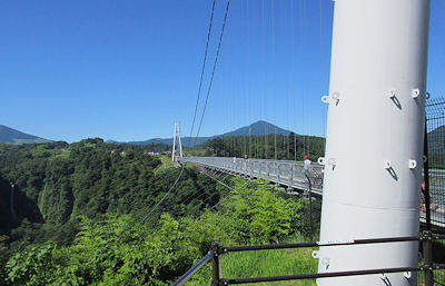 今回はどうしても外せないのだ。天気はばっちりなので、あとは時間内に回れるかということだけだ。時間が足りなかったら耶馬溪(実際は「羅漢寺」)を省略して走る予定だ。 地図ではかなり狭い道を走る感じだったが実際はそうでもなく、早朝で車も少なかったので、途中の景色のきれいさに写真撮影などをした(遠くに見える阿蘇連山がきれいだった)にも関わらずほどなく吊り橋に到着した。周りにいる観光客は観光バスの団体で中国系の人ばかりだ。吊り橋といえば、2001年に九州を縦断したときに宮崎県の「綾町照葉大吊り橋」(高さ142m、長さ250m)に行って、かなり怖かったが今回はそれ以上の高さ173m、 |