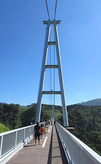 | 長さ390mだ。しかし、こちらの方が造りががっちりしている感じだし、金網状の歩行面も目が細かすぎて、怖さは綾町の吊り橋に軍配が上がる。人が多いのもそう感じる要因の一つかもしれない。しかし、綾町の吊り橋へはかなりの悪路を走らなければならないので、もう一度行こうという気にはなかなかならない。さてここでは、中国系の観光客は入れ替わり立ち替わり記念写真を撮るので、なかなか自分たちの番が回ってこなかった。揺れること | ↓この部分は厳密にはまだ吊り橋ではない