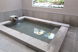 ![]() ↑ 写真左 半露天の貸し切り風呂 右 部屋に付いている御影石の温泉 |