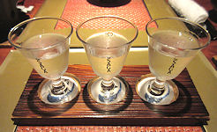 食事も堪能したが、当然のことながらお酒も飲んでいる。最初はやはり生ビール。その次は最近では芋焼酎ということが多いが、今日は「利き酒セット」というのがあったのでそれにしてみた。この手のものは小さな紙に銘柄を書いて持ってくるタイプが多いのだが、ここでは専用のトレイでグラスの下に銘柄が書かれた札が置いてある。これなら一目で何を飲んでいるのかわかって良いアイデアだと思った。それにしても日本酒はやはり効く。 |