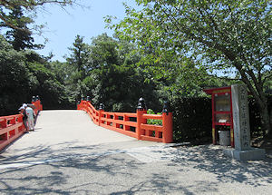 | 上からの写真を撮ることにした。それほど長い橋ではないが赤い色が印象的でなかなか美しい橋だ。写真的にちょっと残念だったのは手前の林だ。すぐ眼下にあるような景色を期待していただけにちょっと残念だった。 | |