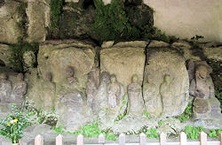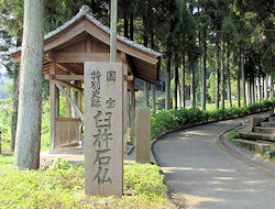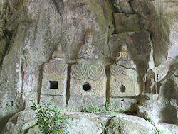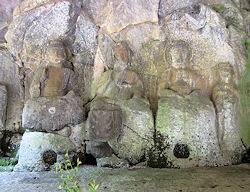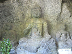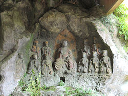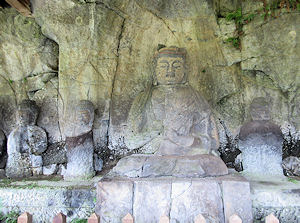 に、実は右の写真を撮るために車を停めたときも一方通行を逆に向いていたことを後から地図を見て知った。しかもその後大きな道に出るまでしばらく逆走したのだ。2日連続の冷や汗だが、それにしても2日とも全く対向車に出会わないというのも驚きだ。不幸中の幸いか…。 この後、別府ICから高速に入ろうと思っていたが、ナビは大分ICを指示したので従ってみる。そして格段混み合うこともなく高速へ。15分程度も走ると臼杵ICで、そこから5分程度で国宝になっている「臼杵石仏」が集まっているところがある。昨日と同じ「磨崖仏」だが、その数も多く、さすがに国宝になっているだけあって見応えが違う。特に急な坂道を登ったりすることもなく、ゆっくりと1時間近くかけて見てきた。自然の岩肌を掘ってできているので、風化があるのはどうしようもないことのようで、学芸員らしき人が調査をしていた。ここは石仏を保護するように建物が建てられていて少しでも風化を防ごうとしているようだ。 |