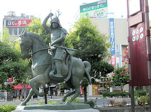 上田到着は15:41で、駅前という名前のホテルは歩いて6〜7分。駅からは見えないので「駅前」という名前はやめてもらいたい。チェックインを済ませてすぐに出かけたが、16時を過ぎてしまったので上田城の観光は明日にして街中をぶらつくことにした。まずは上田駅まで戻って駅前広場にある「真田幸村像」を見る。戦国時代の武将はこういう騎馬に乗った像がけっこうある。周りにいろいろなものがあって、駅からほとんど見えないのが残念だ。 |