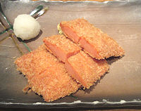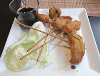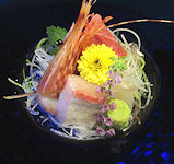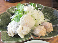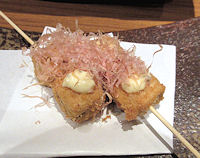 ↑ あまりよく覚えていないが、左から 豆腐サラダ・子持ち昆布の串揚げ・今日のお造り4点盛り・ハムカツ?・寄せ豆腐かな? |
