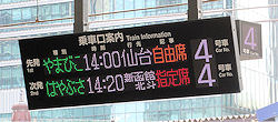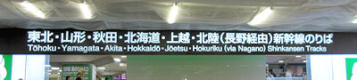 | 今年の3月に北海道新幹線が函館まで開通したのだが、旭川にはほとんど関係がなく関心もなかったのだが、東京駅の新幹線乗り場の案内に「北海道新幹線」が追加されていて何となく感動した。ホームで長野行きの「あさま」を待っているとき、反対側のホームに新函館行きの表示があったのだが、残念ながらこちらの出発の方が早く、列車を見ることはできなかった。 | ![]() ↑ 「豆一豆(まめいちず)」のあんぱん 「メルヘン」のフルーツサンド → ←北海道新幹線のりばの案内 |