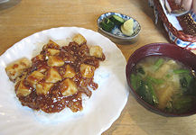 若者が集まる場所っぽい 外観のレストラン→ ← 左 味噌汁付きの麻婆豆腐丼 |