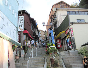 写真上 左 石段街出発地点 中 途中で上を見上げた感じ 下 同じく途中で下を見下ろした感じ けっこう急な階段だ。 写真下 左・中 今回予約した和洋室。純和風だが、ベッドは楽だ。 右 「又左衛門の湯」。北海道のように広い風呂ではない |
