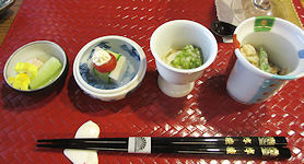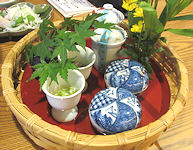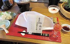 | 夕食の献立 右側の写真 左は席に着いた状態。右下に自家製しそ酒 右は先八寸が2人分カゴに入った状態 下の写真 |