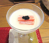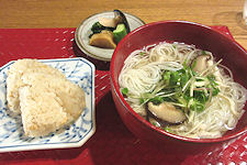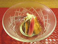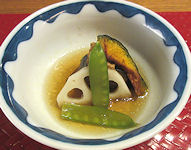 | 三段目 炊合せ 丸茄子揚出・蓮根・絹さや・南瓜 留鉢 鰻と胡瓜の酢の物 食事 ご飯・温麺・香の物 水菓子 季節のフルーツ 純米吟醸酒 |