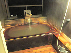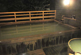 | 食事はボリュームもあって、お腹いっぱいになったので、少し休んでから食後の温泉となった。食後は離れの温泉に行くことにして、そこには貸し切りの露天風呂と普通の露天風呂を楽しんだ。源泉掛け流しの褐色のお湯はなかなかだ。夏だからそんなに温まる必要もないが、湯上がりのビールを美味しく飲むには温まった方がいい。 写真左から 離れの貸し切り露天風呂 離れの露天風呂「権左衛門の湯」 湯上がりのビール |