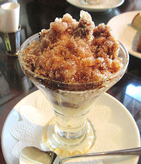 ば」はワンコインという安さで、あっさりしていてとても美味しかった。その近くの店を少し見てまわったが、デザートをということで、「カフェドローム」という店に入った。後から知ったことだが、ここもガイドブックに載っていた。私はエスプレッソのかき氷、妻はシフォンケーキセットを食べた。強いコーヒー味という感じではなかったが、アイスでも何でもコーヒー味があればそれにするのだ。 ←昔ながらの「中華そば」。500円 |