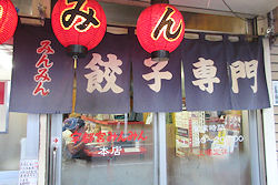 ← たくさんの人が待っている店の前。写真の右側にも団体がいた。 ↓ 左 ようやく店の入口に到達。 右 待ちに待った焼き餃子。美味しかった。 |