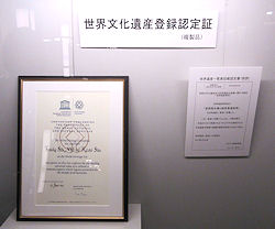 | 写真上 左 富岡製糸場入口。奥に見えるのは東置繭所。 右 西置繭所の保存修理。囲いの中で建物全体を改修している。 写真下 左 世界文化遺産登録認定証 中 操糸所の内部。全部を見ることはできないが一番の見どころ。 右 操糸所の入口。 |