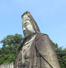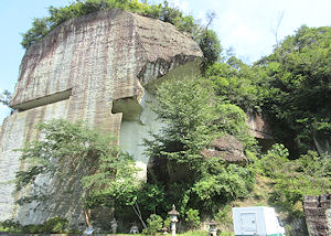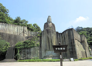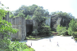 その資料館だが、期待を裏切らないもので、採石したらたまたまこういう形になったのか、それともわざとこういう風に採石したのかわからないが本当に地下神殿のような雰囲気だった。全く知らなかったが、いろいろなアーティストがここで演奏会や撮影をしているようだ。何枚も写真を撮ったのだが、残念ながら持っているカメラではまともに写った写真がほとんどなかった。毎年こういう場面に遭遇するといいカメラが欲しくなる。 地下から上がってきて、入口にあるショップに立ち寄り、ちょっとお洒落な大谷石のコースターを2枚買った。珪藻土のように水を吸う石ということでコースターにはぴったりだ。そしてその後はすぐ隣にある平和観音へ。この辺り一帯が大谷石でできているようで、地上で採石した壁面を削ってできた磨崖仏だそうで、とても大きい。階段があって上まで行けたので観音像の顔を間近で見ることができた。 ←大谷石資料館に入る手前の露面の採石跡。あちこちが洞窟のようになっている。 |