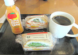 | ホテルの外観を撮影し忘れた。今年のレンタカーはアクア。燃費が良い。→ 8月7日 今日はとりあえず東京に行って、車を返してしまってどこかに行く、ということしか決まっていないが、天気が良いのでスカイツリーに行ってみることにした。日曜日だから混むというのは覚悟の上だ。 今回は素泊まりだったので、ホテルと駅の間にあるスタバでサンドイッチとコーヒー(妻は野菜ジュース)で朝食となった。普段の朝食がこんなものだからちょうど良いかもしれない。旅行中の朝食は基本的に食べすぎなのだ。 ↓ スタバでの朝食。「都会にいる」という気分だ。 |