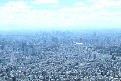 間、その後エレベーターに乗るまでに約15分。立ちっぱなしだからさすがに疲れたが、壁にびっしりと並んだディスプレイの映像がなかなか楽しく飽きない工夫がされている。ようやく乗ったエレベーターは耳が痛くなるということはないがかなりのスピードで、あっという間に地上350mの展望デッキ(フロア350という)に到着だ。この時点で東京タワーの高さを超えているのだからすごい。以前行った東京タワーの特別展望台(250m)ですごいと思ったのに、それより100mも高いのだ。そしてさらにこれにプラス100mの「天望回廊」へ行く(エレベーターが着くのはフロア445)。この回廊をぐるっと歩きながら5m上がってフロア450に到着だ。建物から見ているというより、山の上から見ているような気分になる。ぐるっと回れば360度全ての方面が見渡せる。遮るものが何もないというのは素晴らしい。 ←パンフレットと展望デッキ入場券 カップに入ったソフトクリーム→ |