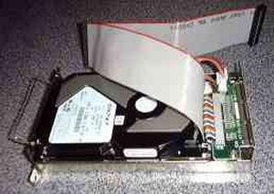 IDE98 さて、Apにはもう一つ大きな問題がありました。内蔵IDE−HDDは540MBまでしか使用できないのです。Xv13で余ったHDDを流用しようと考えていたために頭を悩ませました。メルコ製品しか使ったことがなかったために、I−Oデータ製品にまで目が行っていなかったのです。しかし、Xv13にI−OデータのMOドライブを内蔵したことから、「IDE98」という製品を発見しました(けっこうやっかいものですが)。そして、この後I−Oデータの製品を多用することになりました。 ←拡張スロット1番にIDE98を差し込むところ |