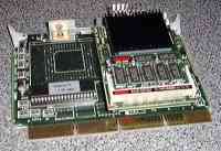 | いよいよ改造へ Xv13の改造成功に気を良くし、「ApでもWindows95を動かそう」と思い立ちましたが、CPU速度の問題もさることながら、240MBHDDではどうにもなりません。しかもメモリ上限は14.6MBです。Xv13の改造でお金もかかったし。しかし、やりだしたら止まらない性格なもので、さらにお金を使うことになってしまいました。 CPUボードにセットしたEUA−QP。メモリは両面に増設↓ |