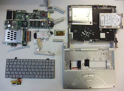 | ついに解体 その後PanasonicのLet's Note R6や工人舎のSCシリーズという小型マシンを購入し、いよいよFIVAの出番がなくなってしまいましたが、じつは使われなくなった理由の一つに、液晶側のいわゆる蓋にひびが入ってしまって、開け閉めするたびに液晶のカバー部分が壊れそうになる、ということがありました。そんなこともあって全く使われないまま、ただ邪魔になってきていたので仕方なく廃棄することにしました。しかし、パソコンは廃棄するにもお金がかかりますし、完璧にばらしたらどんな部品が使われているのかという興味から、完全に解体してみることにしました。 今までの「改造」とは違い、元に戻さなくても良いので思い切ってやることができます。それでも何かの時のためにぐちゃぐちゃにやるのではなく、その気になったら復元できる、くらいの気持ちでやってみました。何度かデスクトップの自作をやっているので、マザー |