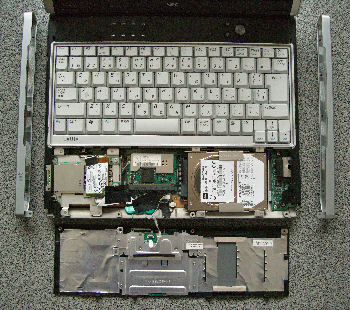 | HDD交換 大きな不満もなく3年ほど使っていましたが、やはり長く使っているとハードディスクがだんだんといっぱいになってきます。購入するときの予算の都合で40GBしか積んでいなかったのでなおさらです。USB外付けを使うという手もあったのですが、携帯用としてならいいですが、据え置いて使うにはやはり内蔵したいところです。 前マシンのNT-1000で初めてノートパソコンの蓋を開けるという経験をしたので、今回も迷わず内蔵HDDを交換することにしました。HDDはパームレストの真下にあって、底面にある数本のねじを外すだけで簡単にたどり着くことができました。全体を包み込むような金具が付いていて、それごと外してドライブを付け替えます。そしてそれを戻してできあがりです。写真を写しながらでも1時間足らずの作業でしたが、これで40GBから120GBになりました。 このときのHITACHIの120GBは8000円強で、ずいぶんと安くなったと感じましたが、その数年後には同じ価格でその数倍の容量が手に入ることになろうとは… |