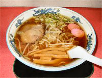 | 看板には「ラーメン・ぎょうざ専門」となっていますが、暖簾には「丼物」とも書かれ、近所の食堂という雰囲気の店です。しょうゆラーメンはもともと500円と安いのですが、10:00〜11:00は早朝サービスで、ライスと漬け物がついて500円、11:00〜14:00のランチタイムにはさらに冷や奴とギョウザまたはザンギがついて600円になっています。スープは比較的あっさり系だと思われ、それを表面に載ったたっぷりの脂で味を整えています。その脂のためかモヤシが入っているのが自然に感じられました。 | |