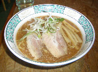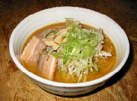 | 2003年の夏に新しくできた店で、席数も少ないこぢんまりとした店です。外見もそうですが中もウッディな感じでなかなか良い雰囲気です。メニューの一番上がみそだったのでみそラーメンを食べてみましたが、「ワインとバターをたっぷり」とメニューに書かれている通りけっこうバターが効いていました。ワインについては、そう書かれていなければ「何の味かな?」という程度です。とんこつベースのまろやかなラーメンでしたが、もう少し塩分があった方が美味しいのではないかと思いました。しょうゆラーメンはほのかに独特の香りがしますが、旭川ラーメンの特徴である濁り系のスープでなかなかのおいしさです。チャーシューはかなり美味しいと思います。最近ではメニューもかなり増えていろいろ楽しめそうです。その後しばらくして行くと、一番人気は「しお」になっていました。白濁したスープですが、見た目よりもあっさりとしています。大きめに切ったネギが合います。 | |