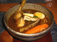 | とても珍しい「カレーラーメン専門店」で、スープがカレーベース、味はみそ・しお・しょうゆというメニュー体系になっています。この3味にそれほど大きな差はなく、いわゆるスープカリーに麺を入れたタイプで、トッピングの具材は写真のようにスープカリーのそれと全く同じです。開店からしばらくしてメニュー体系が変わって、トッピングなしが600円、それに肉・野菜のトッピングを選ぶ方式になりました。標準の仕上がりでは同じ価格になります。肉は、チキンレッグ・スペアリブ・ソーセージの中から選ぶことができます。チキンレッグはまさしくスープカリーの定番であり、スペアリブもとても柔らかい仕上がりでなかなか美味しいです。全体的にはまろやかな感じで、辛さを選べるようになっていますが追加料金が必要です。ちなみにカレーライスも登場しましたが、こちらはスープカリーではなくルーカレーです。 | |