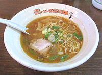 | かなり古くなってしまった感がある「駅前ビル」の中には近所の高齢者が集まるような店がいくつもあって、この店もそんな雰囲気の店です。しかし、ラーメンは侮るなかれという感じで、やや塩分控え目で表面の脂多めですが、しっかりとしたスープで美味しいラーメンです。醤油しかありませんが、何と値段は今時考えられないような300円。ただし、麺は110gということで、1.5玉が一般的なラーメン店の量になります。この場合でも350円ですから、小さいチャーシューが1枚だけ、というようなことを考慮に入れても安いと思います。1玉はちょっと小腹が空いたときにはおやつ感覚でちょうど良いと思います。「にこにこ食堂」ど丼を使っていますが、「息子の店のもの」と言っていました。 |