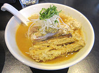 | 鶏白湯が売りの有名店の2号店です。本店はレバーペーストが特徴のようですが、レバーは食べないので、帆立ペーストを使った2号店で食べてみました。鶏白湯らしい濃いスープでコッテリしていますがくどくはありません。ゴボウの天ぷらが2本載っていて味のアクセントになっています。帆立ペーストは少しずつ溶かして食べてみましたが、それほど劇的に味が変わるという感じではありませんでした。 | |