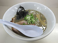 | 2015年末に、久しぶりにできた新店です。無化調で動物系を使わず、数種類の煮干しを使っているというスープのあっさり味は透明スープの「チンタン」(清湯)という名称でしたが、その後普通の「しょうゆ」という名称になりました。動物系を使っていないとは感じない、深みのあるしっかりとした味ですが、やや塩分が強いという印象でした。あとほんの少しスープが多ければ個人的にはちょうど良い感じになりそうです。刻んだタマネギと岩海苔がうまくバランスを取っています。同じしょうゆ味ですが、鶏を合わせたという白湯スープの濃厚しょうゆはかなり印象が変わり、あまり食べたことのない感じの味はやや好みが分かれるかもしれません。麺は食感が旭川麺のストレート麺です。丼は直径が小さく深さのあるタイプで、量はやや少なめのようです。 |