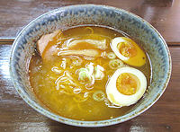 | 味源の本店があったところに、2012年7月1日に新規出店した店です。塩分はやや控え目の優しい味のしょうゆラーメンで、細めの麺ですがしっかりコシがあって美味しいと思います。小ぶりですが厚めのチャーシューがたくさん入っていて、価格以上のものを感じました。みそラーメンは最初やや塩分強めに感じますが、シャキシャキのキャベツとモヤシがたっぷりと載ってどちらかというとあっさり系です。「夢ラーメン」という塩味だけのメニューがあり、これは何と通常価格300円です(開店当初は200円だった)。やや小さめの丼で量も3分の2程度ということですがチャーシューも載っていて、超お得なラーメンです。いやな人は頼めば抜いてくれるようですが、しおベースでラー油が載っていて、ややピリ辛で独特のおいしさです。この味の普通サイズはありません。こればかり注文されると赤字になるとのことなので、写真は味玉をトッピングしたものです(+100円)。店が入ったビルの裏手に駐車場があります。 |